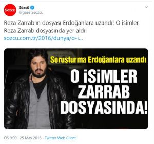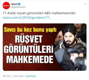 Sözcü 2 Haziran 2016’daki “17 Aralık rüşvet görüntüleri ABD mahkemesinde!” başlıklı haberinde Türkiye’ye kumpas kurulduğunu fiilen kabul ederken, yine de kumpasın tarafı oldu. 13 Temmuz’da FETÖ’nün hedef aldığı Zafer Çağlayan’ı itibarsızlaştırmaya çalışan Sözcü, Adalet Bakanlığının dosyayı inceleme talebini ise kumpas savcısı Bharara’nın ağzından “Türk hükümeti Zarrab davasına müdahale etmek istiyor” şeklinde verdi.