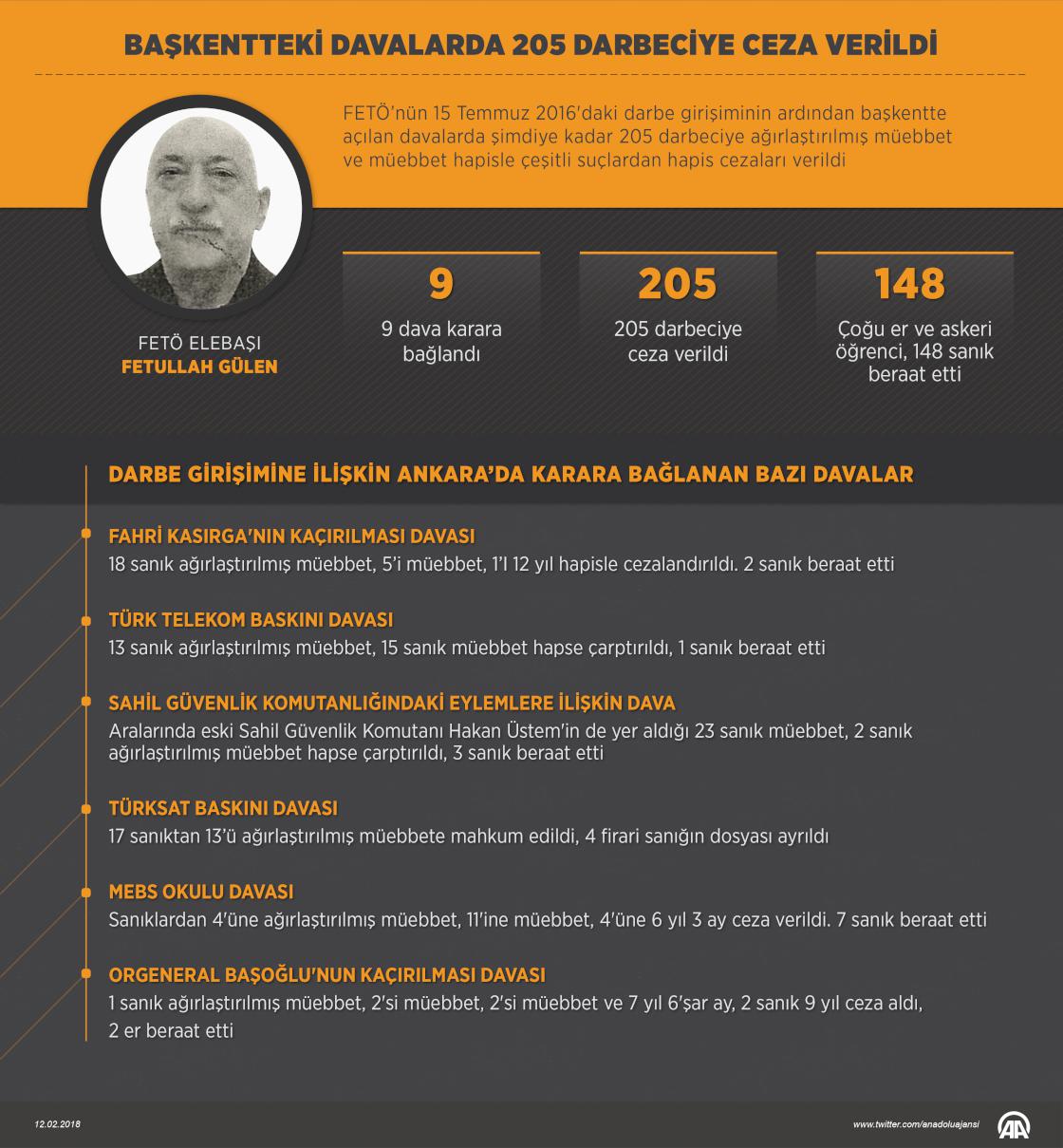 15 Temmuz’dan sonra Ankara’da açılan darbe girişimi davalarında bugüne kadar 205 darbeci, ağırlaştırılmış müebbet, ağırlaştırılmış müebbet ve çeşitli cezalara çarptırıldı.