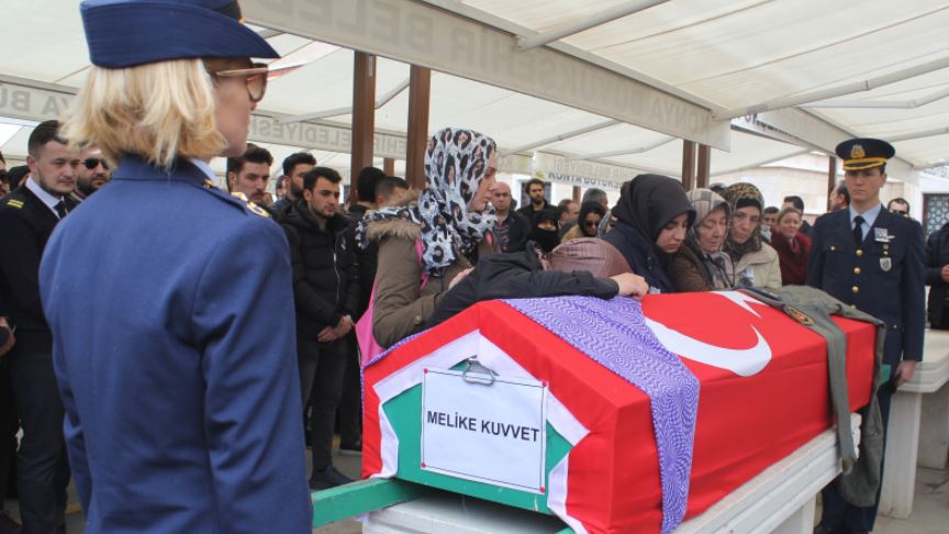 Uçak kazasından sonra dün Konya’daki cenaze töreninde TSK, kadın pilota sahip çıktı. Tabutunun üzerine Türk bayrağı ve orduya dönüşte giyeceği binbaşı rütbeli pilot tulumu örtüldü. Cenaze boyunca hava kuvvetleri subayları tabutu başında nöbet tuttu.