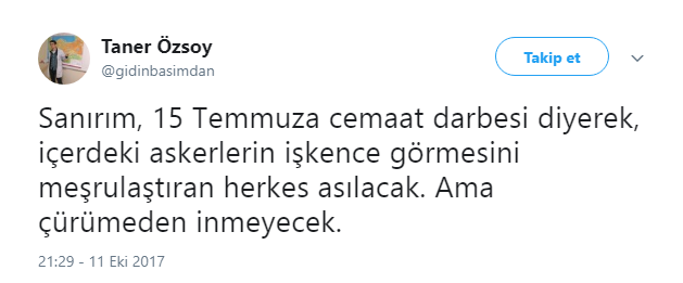 Telefon görüşmelerinde “Türk bayrağından iğreniyorum.” ifadesini kullandığı ortaya çıkan zanlı Özsoy savunmasının devamında,”Darbe gecesinde hâkim, savcı ve askerlere yazdığım yazılar için pişmanım. Türk bayrağından iğrendiğim bahsedilmiş, profil resmim bayrak resmiydi. Tehdit mesajları alıyordum bu yüzden öyle konuşmuştum. Yaptığım telefon konuşmalarından pişmanım.” diye konuştu.