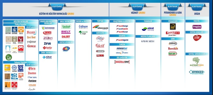 Kaynak Kültür Yayın Grubu, Zambak Okul Yayın Grubu, Sürat Sınavlara Hazırlık Yayın Grubu, Kaynak Telif Ajansı, NT Mağazaları, Gökkuşağı, Çağlayan Matbaası, Kaynak Kağıt, Kaynak Medya, Sürat teknoloji, Sürat Eğitim Araçları, Alfa, PAL, Inspire, Nüanstur, Sürattur, Sürat Kargo, Sürat Lojistik, Bereket Yemek, İtina Toptan Gıda, İtina Et ve Süt Ürünleri