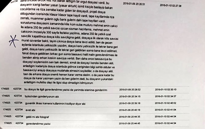Yazışmalarda, Gök’ün Kilis’te görev yaptığı dönemde, sözde 17/25 Aralık kumpas dava dosyalarıyla ilgili örgüt abisine bilgi aktardığı tespit edildi.