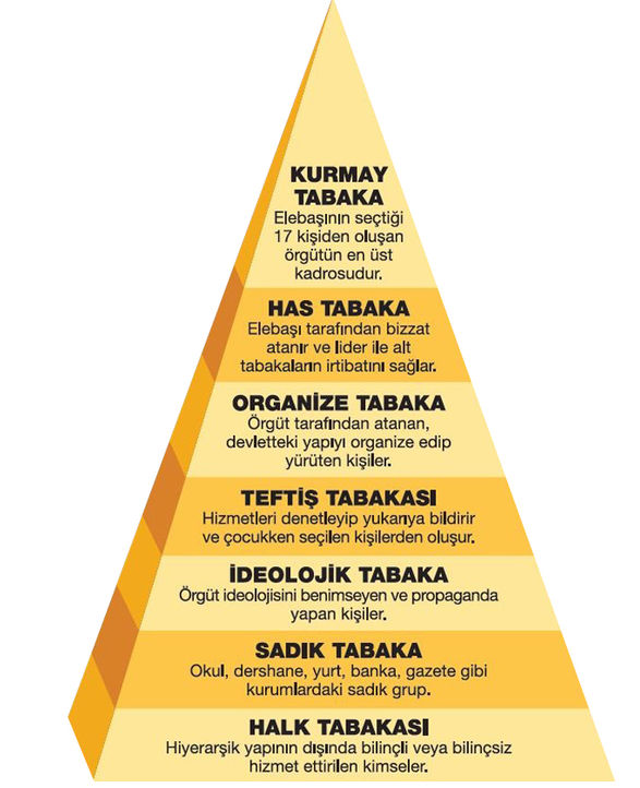 Örgütün hiyerarşik yapılanmasının tabaka kat sistemine dayandığı, katlar arasında geçişler mümkün ise de 4’üncü kattan sonraki geçişlerin örgüt lideri Gülen tarafından belirlendiği kaydedilen kararda, piramidin basamakları şu şekilde sıralandı: