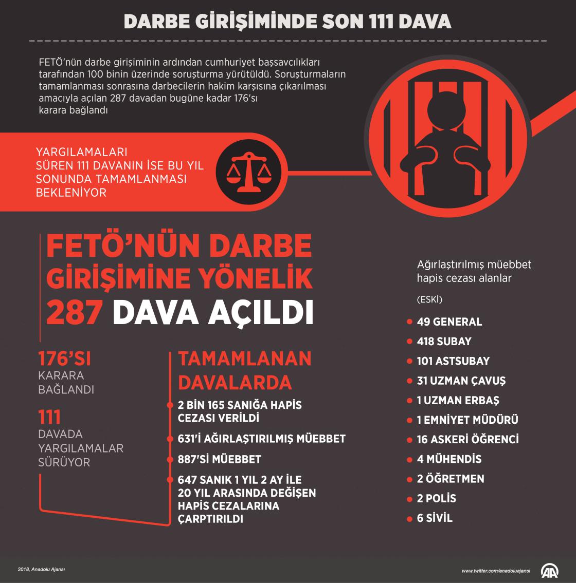 FETÖ’nün darbe girişimine ilişkin açılan 287 davadan 176’sı mahkeme heyetleri tarafından karara bağlandı, 111 davada ise darbecilerin yargılanması devam ediyor.