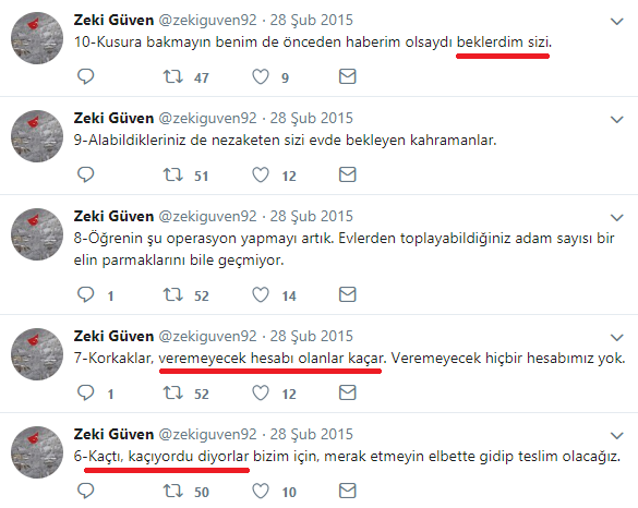 FETÖ’nün kaset kumpasçısı Zeki Güven’in Twitter hesabından, “Alabildikleriniz de nezaketen sizi evde bekleyen kahramanlar”, “Öğrenin şu operasyon yapmayı artık. Evlerden toplayabildiğiniz adam sayısı bir elin parmaklarını bile geçmiyor”, “Korkaklar, veremeyecek hesabı olanlar kaçar. Veremeyecek hiçbir hesabımız yok”, “Kaçtı, kaçıyordu diyorlar bizim için, merak etmeyin elbette gidip teslim olacağız.” ifadelerini kullandığı belirlendi.
