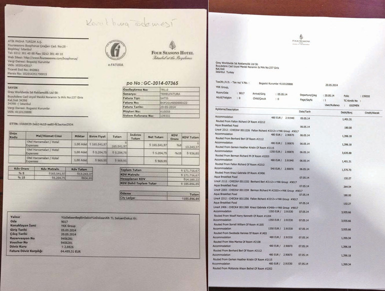 Hâkim Richard Berman ile FETÖ ilişkisi sadece bununla sınırlı değil. Berman, sempozyumun düzenlendiği Four Seasons Hotel’de 2203 No’lu odada kalmış. Berman’ın 6 Mayıs’ta giriş yapıp 1 gecelik kalışı için otele 480 Euro ödenmiş. Kim tarafından? FETÖ’cü YKK Group tarafından. Hâkim Berman, Four Seasons Hotel’e ait 20.05.2014 tarihli toplu kesilen faturada yer alan ödeme için açıklama yapma durumunda.