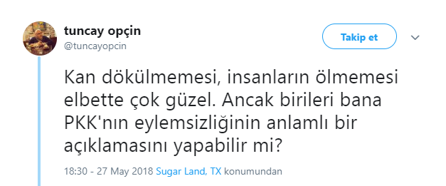 Tuncay Opçin Twitter’da paylaştığı mesajda “terör saldırısı” yerine “eylemsizlik” ifadesini kullanırken başarılı operasyonlarla PKK’ya art arda darbe vurulmasını da “anlamsız” buldu.