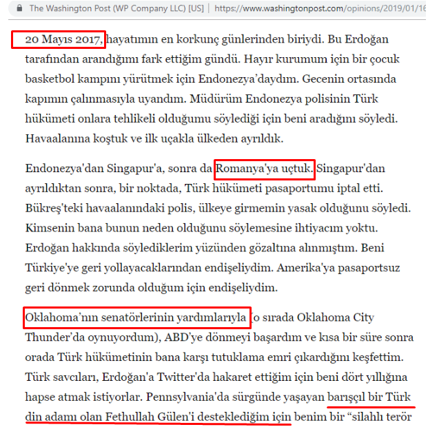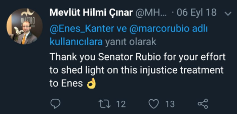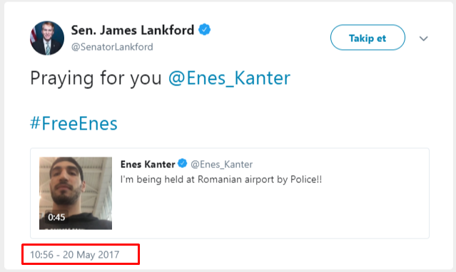 Aynı tarihte Senator Lankford’ın twitter hesabından Kanter için yaptığı çağrı ise şöyle: