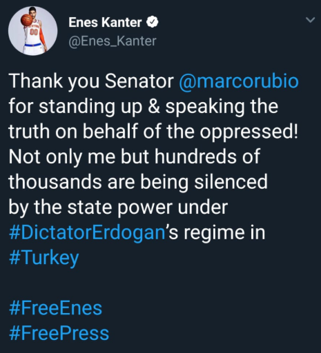 “Bu genç adamın Türk vatandaşı arkadaşlarının haklarını savunmak için gösterdiği cesaretten etkilendim. Bugün Enes Kanter ile toplantı yapmaktan onur duydum. Cumhurbaşkanı Recep Tayyip Erdoğan yönetimi altındaki Türkiye’deki insan hakları ihlallerini tartıştık.”