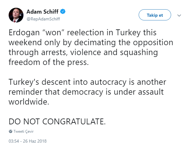 15 Temmuz darbe girişiminin 1 numaralı sanığı Gülen’in, kendisi gibi Türkiye düşmanı manevi oğlu Kanter’le samimi pozlar çektiren ABD’li senatör, Adam Schiff, 24 Haziran cumhurbaşkanlığı seçimlerinde Erdoğan’ın galibiyetinden rahatsızlık duymuş, bunu da yine sözde insan hakları ihlallerinden dem vurarak açıkça belli etmişti.