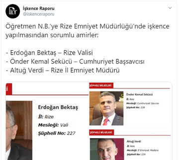 Rize Emniyet Müdürü Altuğ Verdi’yi makamında şehit eden polis memuru İsmail Hakkı Sarıcaoğlu’nun eşi Semiha Sarıcaoğlu ve doktor ağabeyi Mustafa Sarıcaoğlu FETÖ üyesi olduklarını itiraf etti. Mustafa Sarıcaoğlu, kardeşinin 15 Temmuz sonrası gözaltına alınanlara işkence yapmakla suçladığı Altuğ Verdi’den nefret ettiğini söyledi.