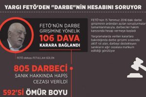15 Temmuz darbe girişimine yönelik açılan ve karara bağlanan 106 davada, 592’si ömür boyu olmak üzere 805 darbeci hakkında hapis cezasına hükmedildi...