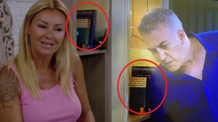 Dizide kullanılan bir kitaplıkta, FETÖ’nün yurt dışındaki sözde eğitim faaliyetlerini tanıtan “Barış Köprüleri; Dünyaya açılan Türk Okulları” isimli kitap izleyicilere gösterildi.