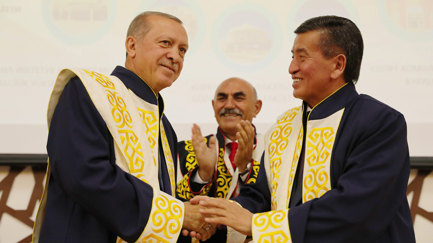 Erdoğan, Kırgızistan-Türkiye Manas Üniversitesinde düzenlenen “Fahri Doktora Payesi Tevcihi” ile “Kırgızistan-Türkiye Manas Üniversitesi Yeni Tesislerin Toplu Açılış Töreni”ne mevkidaşı Sooronbay Ceenbekov ile katıldı.