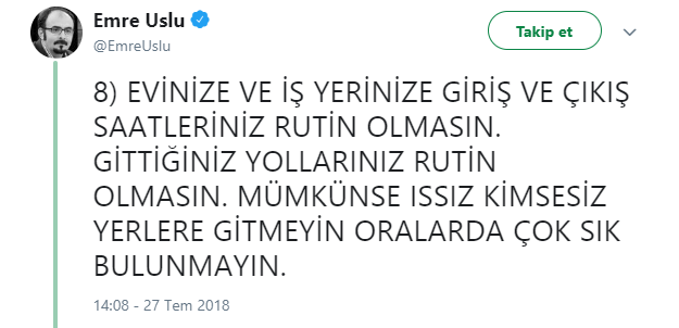 Uslu, yine sosyal medya hesabından FETÖ’cüleri yakalanma ihtimaline karşı uyararak evlerine giderken aynı güzergahı kullanmamaları ve sosyal medyayı yakından takip etmeleri gerektiğini yazdı. Yeni yapılanmanın, yurt dışı ve yurt içinde örgüte destek vermeye devam eden üyelerle haberleşmek için yeni şifreli programlar geliştirdiği de tespit edildi.