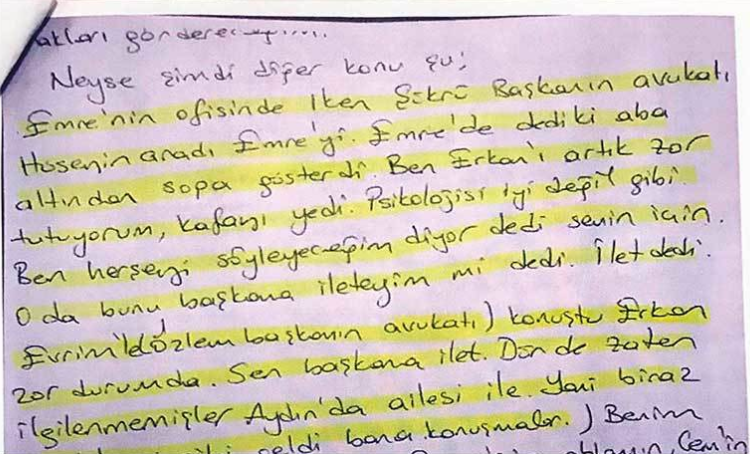 Selma Karaarslan eşine yazdığı mektupta CHP Milletvekili Tuncay Özkan ile görüştüğünü, avukatları Emre Kılıçarslan’ın ise Ekrem İmamoğlu’nun avukatıyla görüştüğünü belirtti. CHP’li Aydın Belediye Başkanı Özlem Çerçioğlu’nun kendisine “özel ilgi” gösterdiğinden de bahsetti.