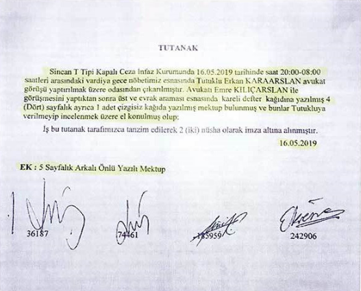 FETÖ imamı Karaarslan, tutuklu bulunduğu Sincan T Tipi Kapalı Ceza İnfaz Kurumunda avukatı ile görüştü. Avukat Emre Kılıçarslan’ın üzerinde FETÖ imamı Karaarslan’ın eşi Selma Karaarslan tarafından yazılan bir mektup ele geçirildi.