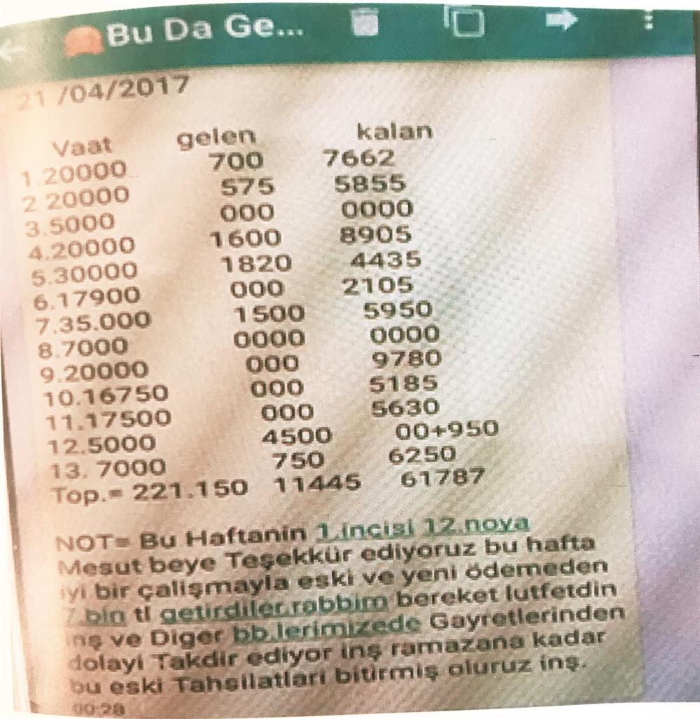 2016 yılı içinde toplanan bir kısım paralar için bilançonun çıkarıldığı sohbetlerde, örgüt adına en çok para toplayanlar övülerek teşvik edildi. Altında “NOT” şeklinde paylaşılan mesajda ise “Bu haftanın birincisi 12 no’ya, Mesut Bey’e teşekkür ediyoruz. Bu hafta iyi bir çalışmayla eski ve yeni ödemeden 7 bin lira getirdiler. Rabbim bereket lütfetsin inşallah.” ifadeleri göze çarptı.