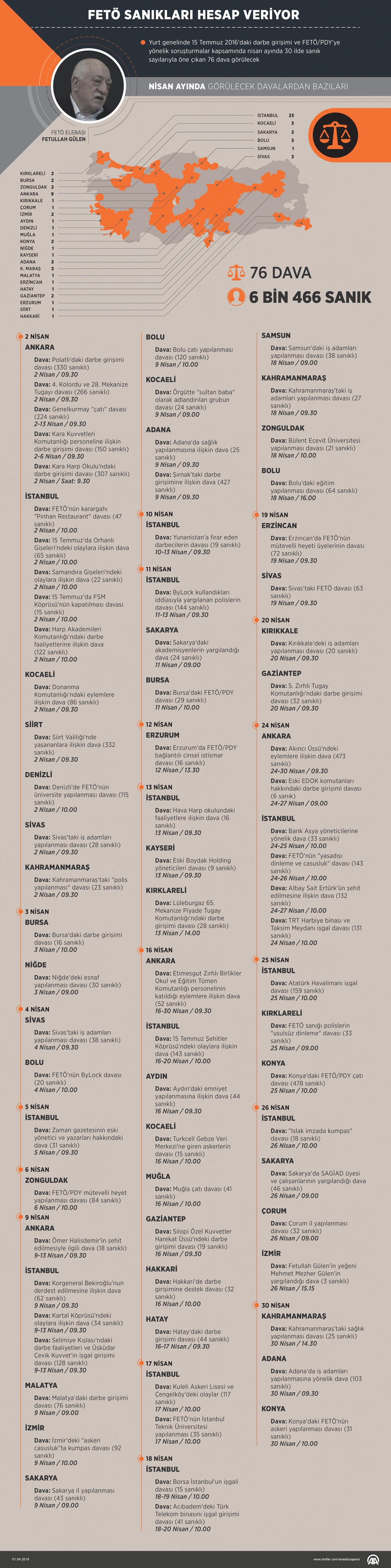 Bu kapsamda nisan ayında 30 ilde sanık sayılarıyla öne çıkan 76 dava görülecek. Bu davalarda 6 bin 466 FETÖ sanığının yargılanmasına devam edilecek.