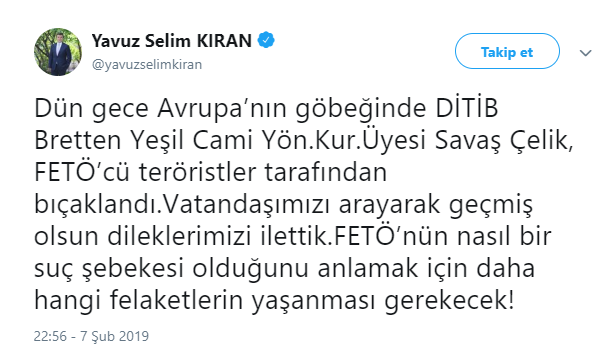 Resmi Twitter hesabından açıklama yapan Kıran, “Dün gece Avrupa’nın göbeğinde DİTİB Bretten Yeşil Cami Yön.Kur.Üyesi Savaş Çelik, FETÖ’cü teröristler tarafından bıçaklandı. Vatandaşımızı arayarak geçmiş olsun dileklerimizi ilettik. FETÖ’nün nasıl bir suç şebekesi olduğunu anlamak için daha hangi felaketlerin yaşanması gerekecek!” ifadelerini kullandı.