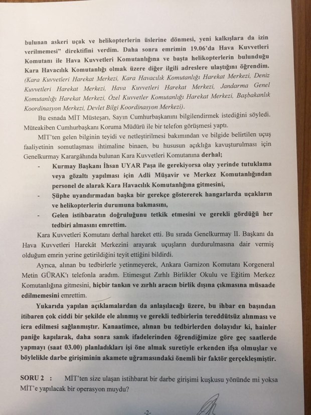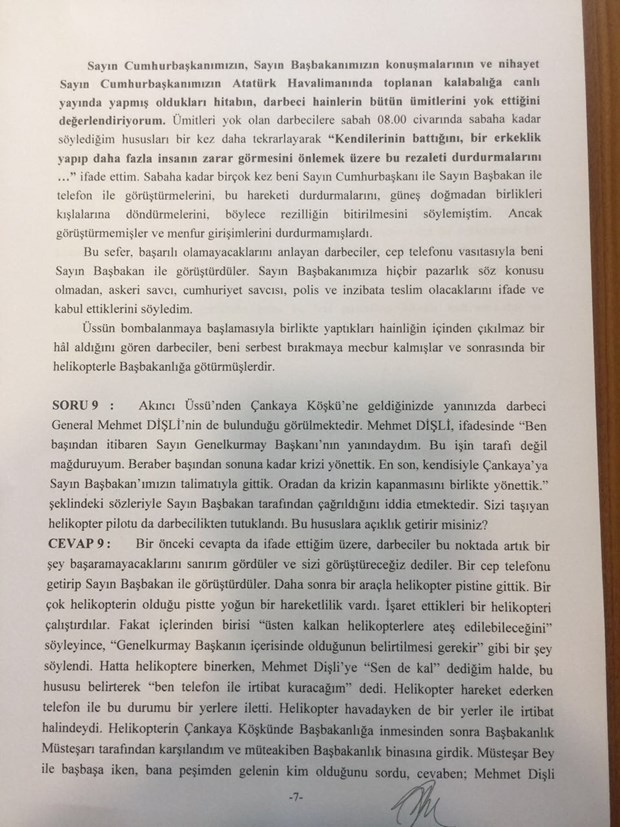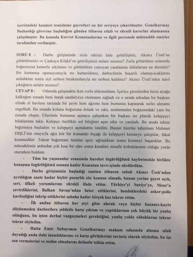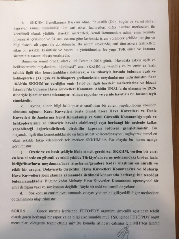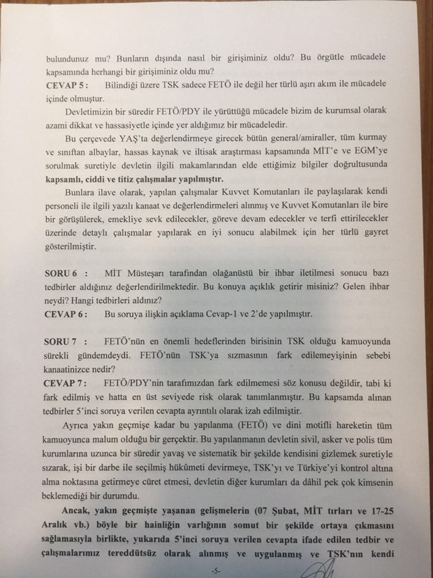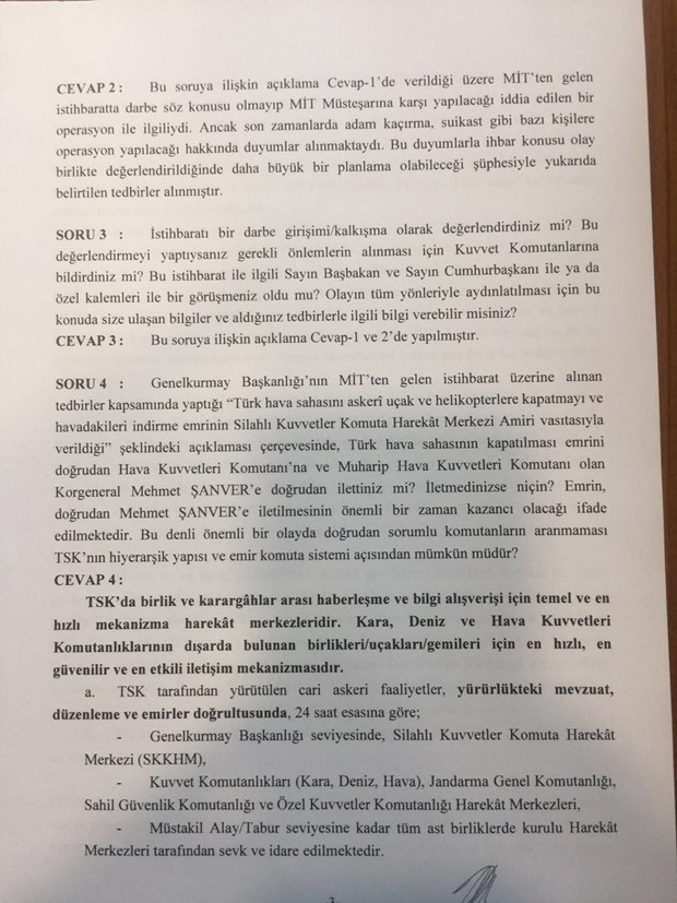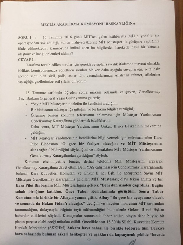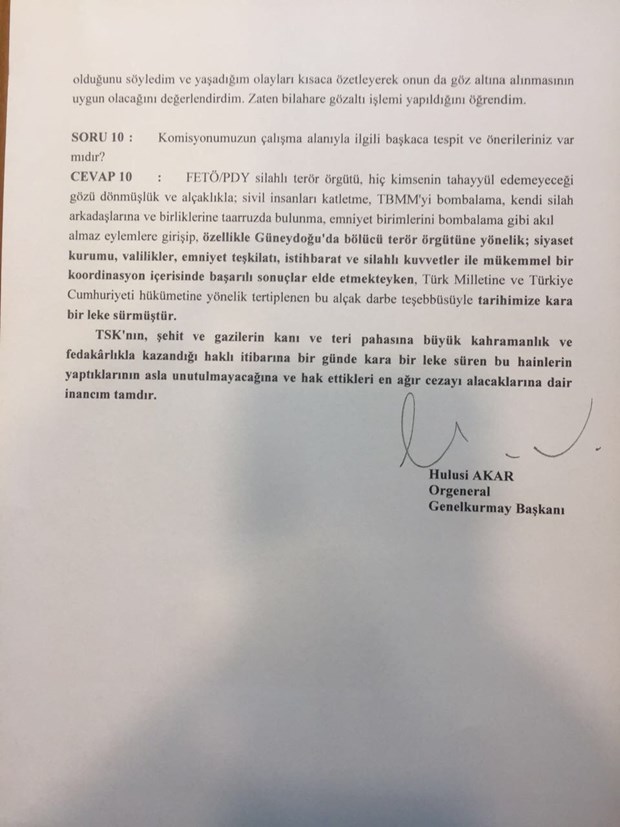 Genelkurmay Başkanı Hulusi Akar’ın 15 Temmuz Darbe Girişimini Araştırma Komisyonu’nun sorularına verdiği yanıtlar ortaya çıktı.