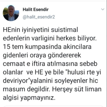 Esendir, sosyal medya hesabından örgüt yöneticilerini eleştirirken Akıncı Üssü’nde 15 Temmuz 2016’da bulanan sivil imamların FETÖ yöneticileri tarafından vazifelendirildiğini açıkça itiraf ediyor. Akıncı Üssü’nde yakalan sivil imamlar, Kemal Batmaz, Harun Biniş, Hakan Çiçek ve Nurettin Oruç darbeyle bir ilgileri olmadıklarını iddia etmişlerdi.