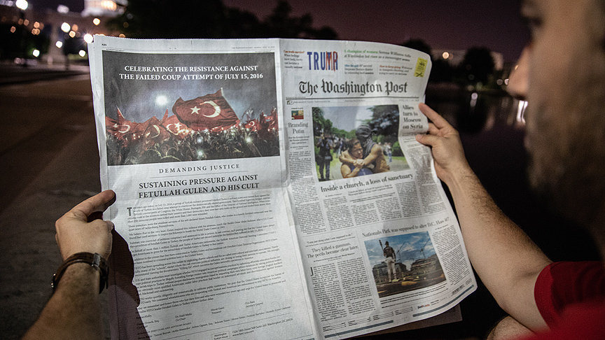 ABD’nin önde gelen gazetelerinden Washington Post’ta yayımlanan tam sayfa ilanda, Amerikan kamuoyu FETÖ’ye karşı uyarıldı.