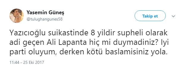 Güneş, Twitter hesabında “Yazıcıoğlu suikastında 8 yıldır şüpheli olarak adı geçen Ali Lapanta’yı hiç mi duymadınız? İyi parti olayım derken kötü başlamışsınız yola.” ifadelerini kullandı.
